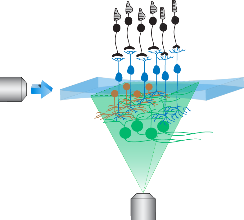 Built on principles of restricted planar imaging, light-sheet fluorescence microscopy enables measurements of neural activity at single-cell resolution across large regions of the ex vivo retina (read more). For functional characterization, we target retinal interneurons and ganglion cells for GCaMP expression. We are also refining these tools to study signal propagation within circuits, and within neuronal compartments such as dendrites and axons.